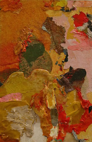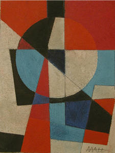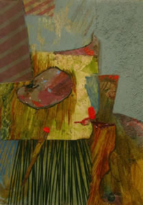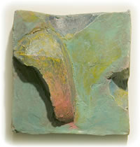 George Handy of Asheville is familiar to most gallery patrons as a potter. However, a few years ago, George's studio was lost in an auto accident and he turned to painting. His abstract relief paintings bear the same gestural markings and floating forms as did the surface decoration on his ceramic works.