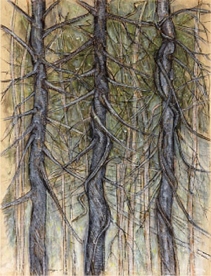 Painters Joyce Fillip of Raleigh and Barbara Fisher of Asheville explore southern symbols, real and surreal, while drawings by Robert Marsh of Danville, Va., depict southern classic landmarks like front steps, a family cemetery and a golf course.