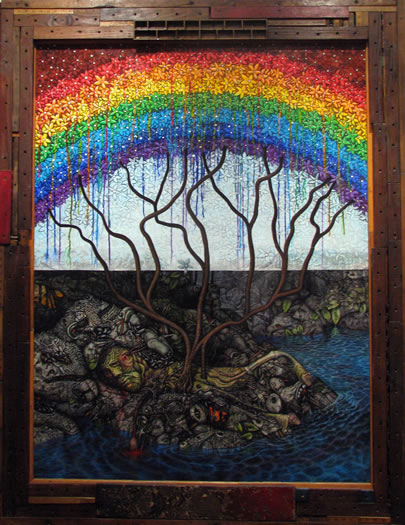 acrylic on collage attached to panel 70 ½ x 55 ½ in